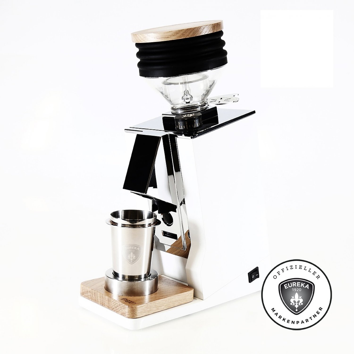 Neuer Single Dose-Bohnenbehälter mit Eichenholzdeckel (45 g) und drehbarem Metallschieber.
