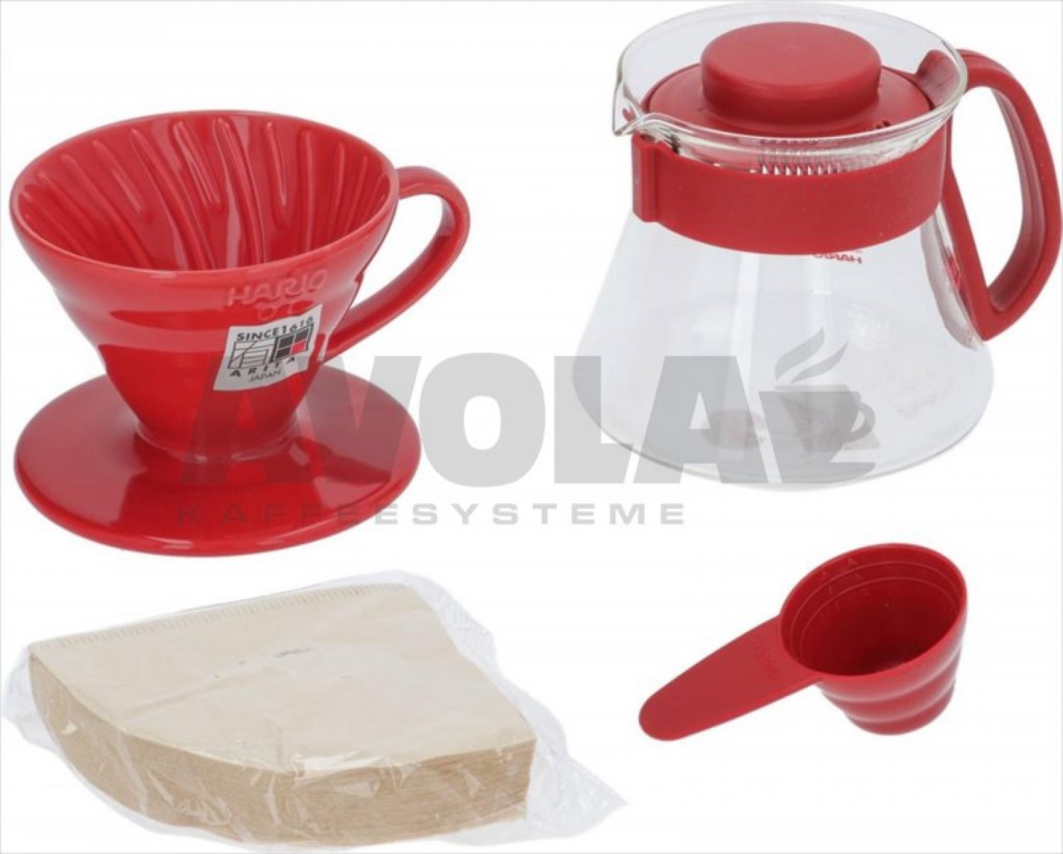 Kaffeefilter aus Keramik 1-2 Tassen|Glaskaraffe 360 ml 1/2 Tassen|Gesamthöhe montiert 175 mm|Durchmesser 107 mm|mit 50 Filtern geliefert|Farbe rot|Spülmaschinenfest|Modell VDS-3012R