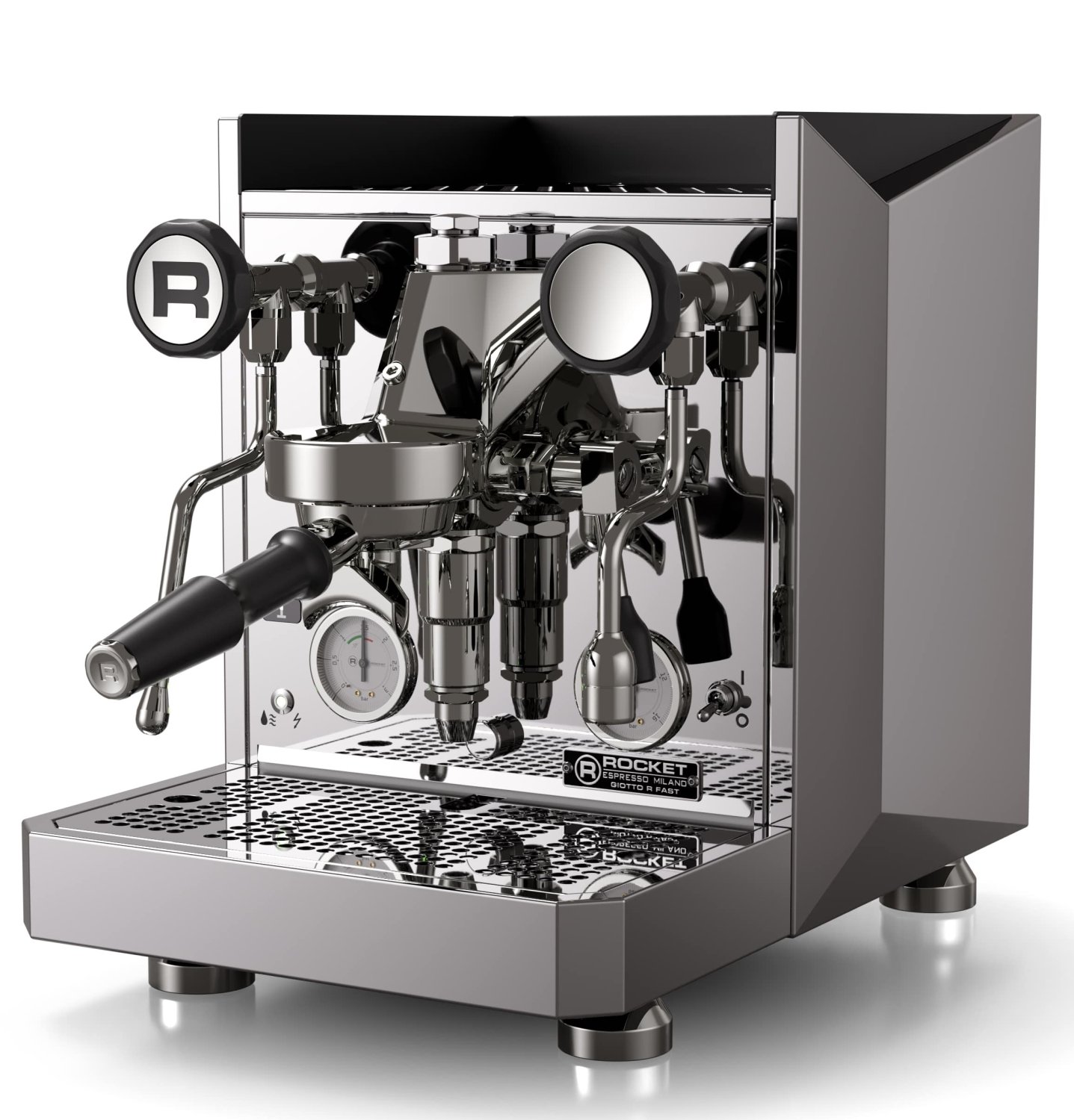 Optisch überzeugt die Rocket Giotto R Fast Chrom Espressomaschine mit ihrer markanten, kantigen Linienführung und dem unverwechselbaren Giotto-Design. Das hochglanzpolierte Chrom-Edelstahlgehäuse verleiht der Maschine eine besonders edle, reflektierende Oberfläche und unterstreicht ihren professionellen Anspruch.